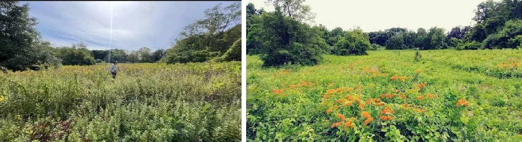 Monarch butterflies are threatened by climate change and the widespread loss of habitat, especially in the Midwest due to modern agricultural land-use practices. Monarch populations have declined by approximately 80% from their peak in 1996. Biologists have determined that there is a strong possibility that this species, given its tumultuous population crashes and rebounds, could become extinct in the coming decades unless action is taken. We can help reverse this trend by planting milkweed and establishing Monarch Waystations. Monarch Waystations are sites containing nectar-producing plants and, crucially, milkweed (Asclepias spp.), which is the only genus of host plants on which Monarchs will lay their eggs and that supports the Monarch’s complete life cycle from egg to caterpillar to chrysalis to adult. Butterflyweed (Asclepias tuberosa) is displayed on the right both in flowers and in the Guggenheim meadow.