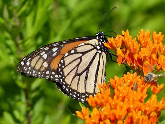 Monarch butterfly and bee nectaring on butterflyweed (Asclepias tuberosa)